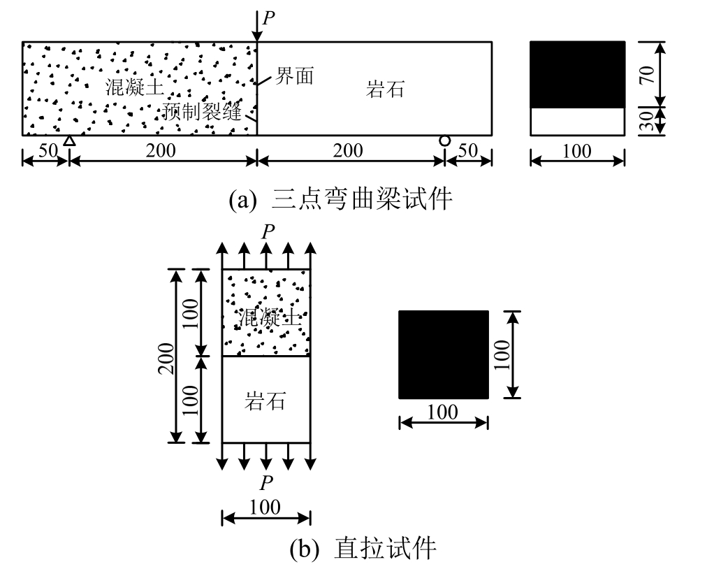 本批次试验包括三点弯曲梁复合试件、界面直拉试件。三点弯曲梁试件尺寸为100 mm×100 mm×500 mm,其中混凝土和岩石部分尺寸均为100 mm ×100 mm×250 mm。自然粘结界面高100 mm,包含70 mm的粘结段和30 mm的预制裂缝段。预制裂缝通过粘贴两片减摩片实现,减摩片尺寸为100 mm×30 mm,试件的具体尺寸和预制裂缝设置如图1所示。
