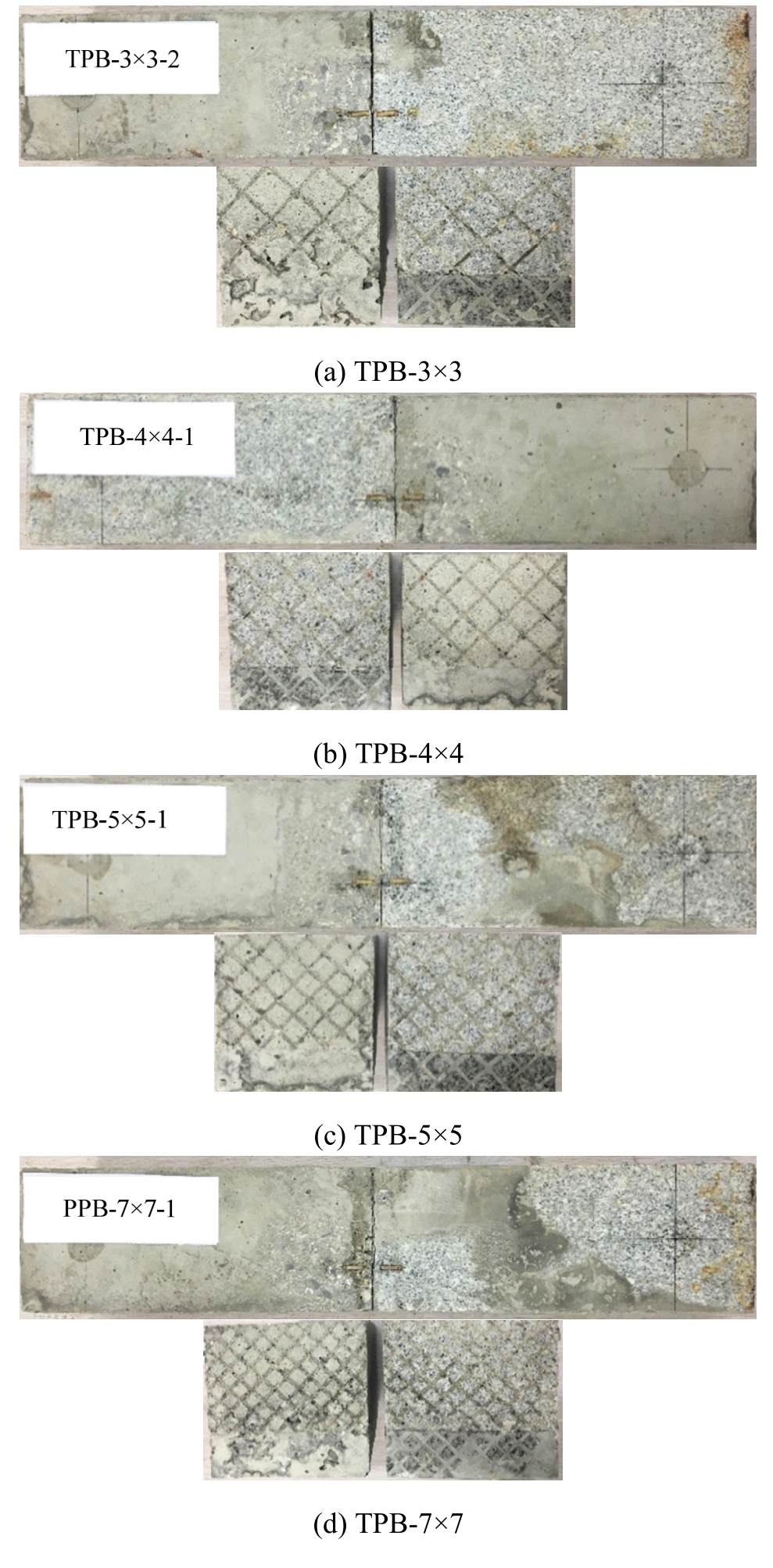 为了研究界面粗糙度对复合界面断裂参数的影响,本次试验对岩石界面进行了刻槽处理[1],刻槽工作在全自动化仪器上进行,以实现槽口尺寸的标准化。槽口深度3 mm,槽线均平行于对角线。本批次三点弯曲梁试件共包含六种界面粗糙度,分别为3×3、4×4、5×5、7×7、10×10和12×12。以3×3为例,数字3表示岩石表面侧边被平分成3份,各粗糙度界面如图2所示。