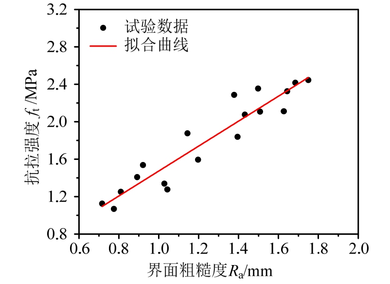 当粗糙度介于0.716~1.801的范围内,岩石-混凝土界面抗拉强度 ft随着粗糙度增大而提高,从1.068提高到2.445,提高了129%。两者的线性拟合公式为ft =1.326Ra+0.149,相关系数R2=0.882。