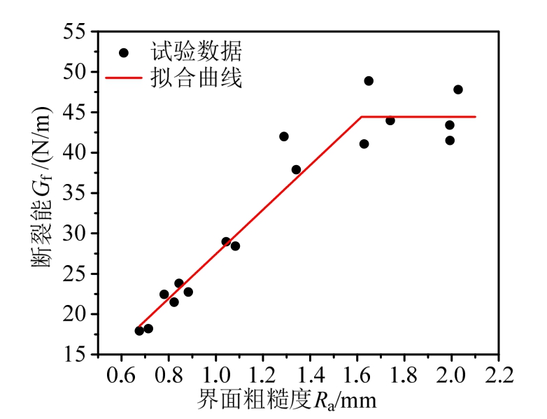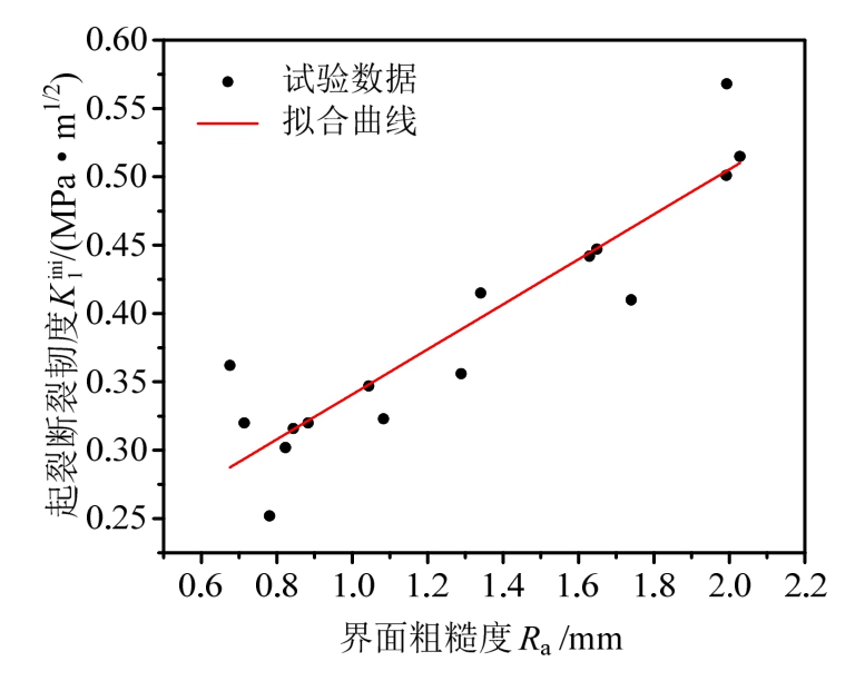 线性相关系数 R2为0.832。本试验的界面粗糙度Ra从0.676增加到2.028,界面Ⅰ型起裂断裂韧度