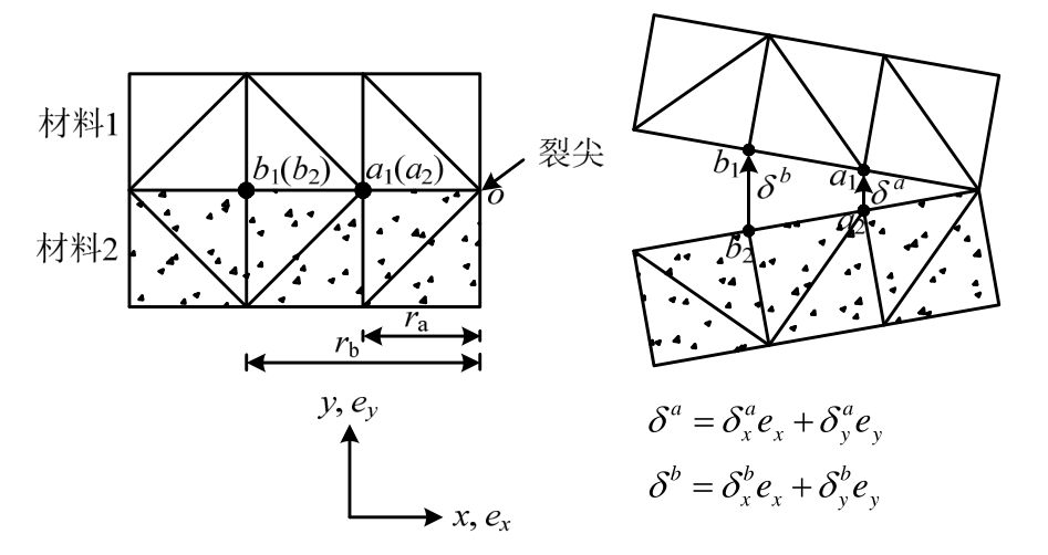 式中:Ei和νi分别表示弹性模量和泊松比。实际计算中,选取裂尖附近的的两对节点(a1,a2)和(b1,b2),如图9所示,将裂缝表面两对节点之间的相对位移