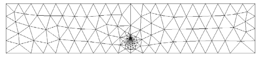图11是二维有限元模型,采用PLANE 183单元,具有2维8节点和二次位移函数,能够较好地应对不规则模型的网格划分。模型尺寸和边界条件与实际试件保持一致,材料参数取试验实际测量结果。裂尖处进行了细密的网格划分以适应裂缝尖端复杂的应力场和位移场。在该模型上施加试验测得的起裂荷载计算![]()