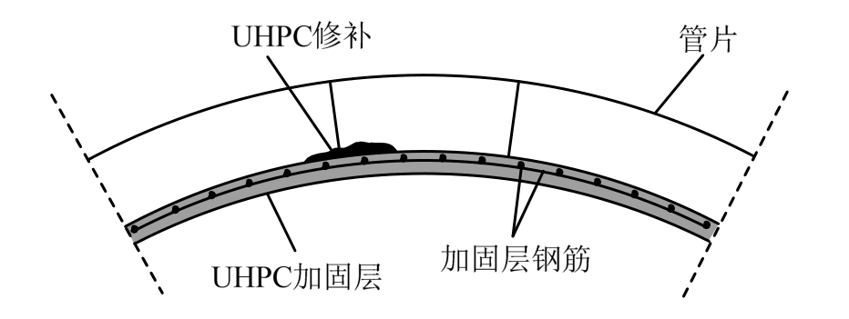 基于以上特性,拟采用的UHPC加固管片的方法是在隧道内表面通过喷射混凝土或浇筑涂抹的方式施作一层配筋UHPC加固层。具体方法如图1所示,其加固步骤为:1) 对管片严重开裂位置灌注UHPC进行修补;2) 对管片内表面进行喷砂、凿毛等处理;3) 植入定位钢筋,并紧靠管片内壁施作加固层钢筋;4) 施作UHPC加固层。