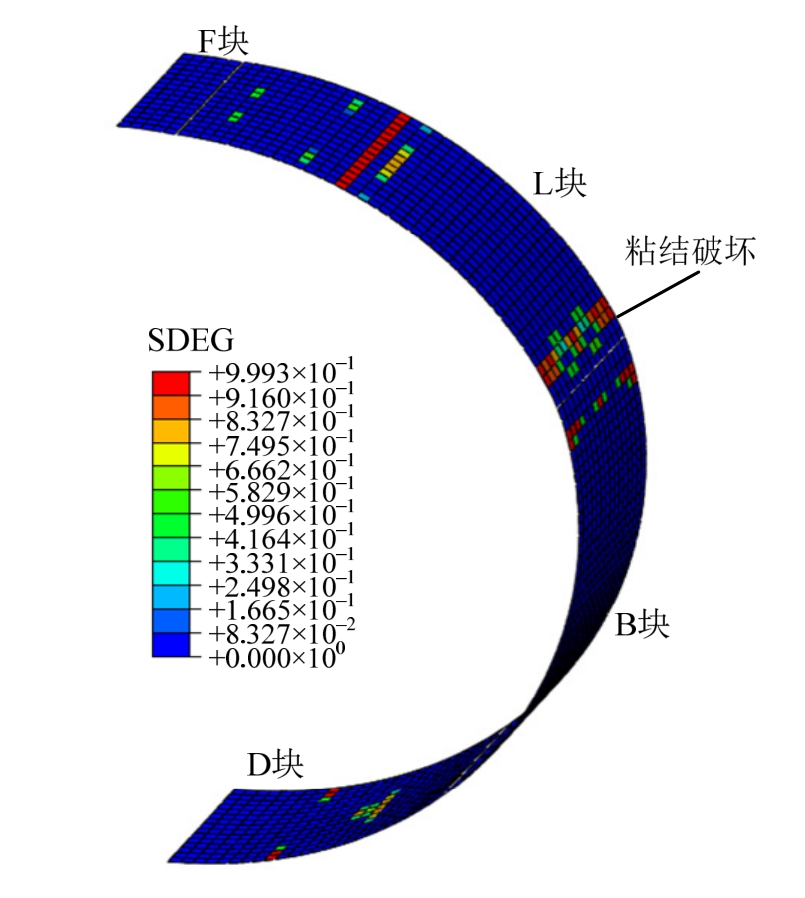 当P1持续增大达到500 kN时,在73°接头截面处,受压区混凝土压应变急剧减小,直至严重受拉,从RC-UHPC交界面Cohesive单元的损伤状态可以看出(见图13,SDEG为刚度衰减系数,SDEG=1时“Cohesive”单元删除),此时73°接头附近发生了局部粘结破坏。随着加固层与管片混凝土界面逐渐剥离,二者开始逐渐独自受力,8°接头处UHPC及加固层钢筋拉应变急剧增加,直至加固层钢筋受拉屈服,再次发展为“塑性铰”。此时拱底块D内排钢筋虽也发生屈服,但位于截面受拉区的加固层钢筋可继续承载,未形成“塑性铰”。最终,将1/2结构模型等效为整环管片,再次产生位于8°接头和73°接头处的4个“塑性铰”,结构失稳。