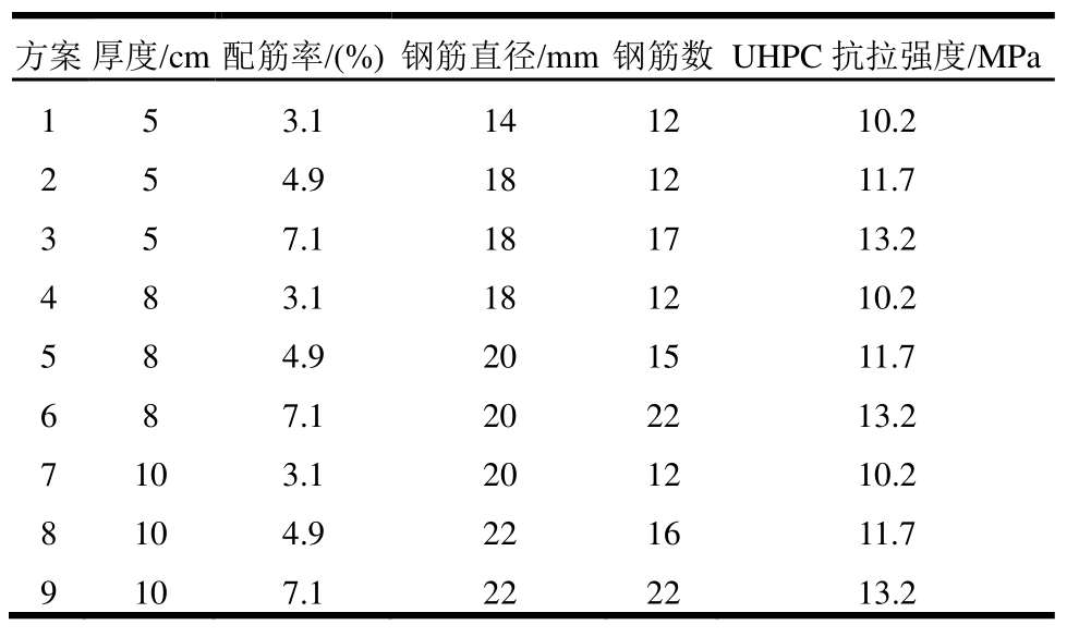 方案厚度/cm配筋率/(%)钢筋直径/mm 钢筋数 UHPC抗拉强度/MPa 15 3.1 14 12 10.2 25 4.9 18 12 11.7 35 7.1 18 17 13.2 48 3.1 18 12 10.2 58 4.9 20 15 11.7 68 7.1 20 22 13.2 710 3.1 20 12 10.2 810 4.9 22 16 11.7 910 7.1 22 22 13.2