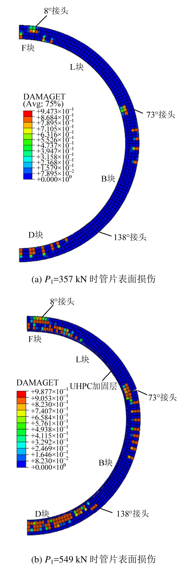图7为混凝土管片加固前后的损伤对比图。根据CDP模型中DAMAGET损伤指标(DAMAGET为抗拉刚度折减系数,DAMAGET=1时完全失效)可以看出,在加载达到加固点时隧道表面已出现损伤,主要分布在标准块B的外弧面以及拱底块D的内弧面;加固后,外弧面损伤分布在标准块B处,内弧面损伤主要出现在接邻块L和拱底块D处,如图7所示。加固点前的损伤分布与足尺试验开裂分布相一致,验证了该损伤模型在模拟管片裂缝方面的合理性,并由此可预测管片在UHPC加固下的裂缝发展情况。