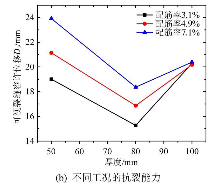 管片在加固后,管片结构的抗裂性能得到有效提高,最大可视裂缝容许位移可达23.9 mm。随着加固层厚度的增加,内表面的抗裂能力先减小后增大,可能是因为在厚度较小时,此时结构变形较大,当加固层厚度增加,则UHPC表面距离截面中性轴及钢筋越远,导致更易开裂;而当加固层厚度增加到一定程度时,此时大大控制了结构变形,结构受拉应变小而更不易开裂,且此时受配筋率的影响较小。