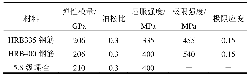 管片混凝土和加固层UHPC均采用“CDP”(concrete-plasticity model)材料模型,模型所需参数见表1。其中,管片混凝土的的参数基于《混凝土结构设计规范》(GB 50010―2010)附录C2提出的混凝土骨架曲线及损伤参数,采用Birtel等[16]提出的方法确定。UHPC的应力-应变关系参照Al-Osta等[12]的单轴拉压试验确定,如图4所示。不同型号的钢筋及螺栓均采用塑性模型,主要力学参数参考《钢筋混凝土用钢第一部分:热轧光圆钢筋》(GB 1499.1―2008),具体参数如表2所示。