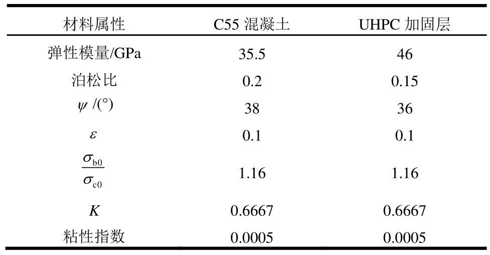 材料属性 C55混凝土 UHPC加固层弹性模量/GPa 35.5 46泊松比 0.2 0.15 ψ/(°) 38 36 ε 0.1 0.1 σσ 1.16 1.16 b0 c0 K 0.6667 0.6667粘性指数 0.0005 0.0005