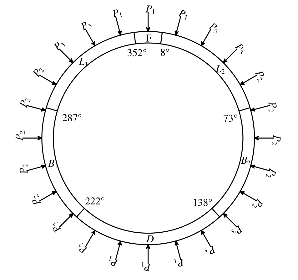 Liu等[15]开展了内张钢圈加固上海地铁通缝拼装盾构隧道管片模型试验。为了验证本文提出UHPC加固方法的有效性,以该文管片为研究对象,建立三维有限元模型,从管片受力变形、裂缝开展等方面开展对比研究。Liu等[15]文中给出的上海地铁盾构管片环外径6200 mm,内径5500 mm,管片厚度350 mm,幅宽1200 mm。单环管片由1个封顶块F(16°)、2个邻接块L1和L2(各65°)、2个标准块B1和B2(各65°)以及1个拱底块D(84°)组成。管片混凝土强度等级C55,钢筋采用HPB235级、HRB335级钢,主筋净保护层取50 mm,钢筋及构造均参照实际工程施工图设置。管片块之间每道纵缝由2根5.8级M30直螺栓连接。荷载通过沿管片环均匀设置24个点位施加,分P1、P2与P3共3组。如图2所示,加载全过程分4个阶段: