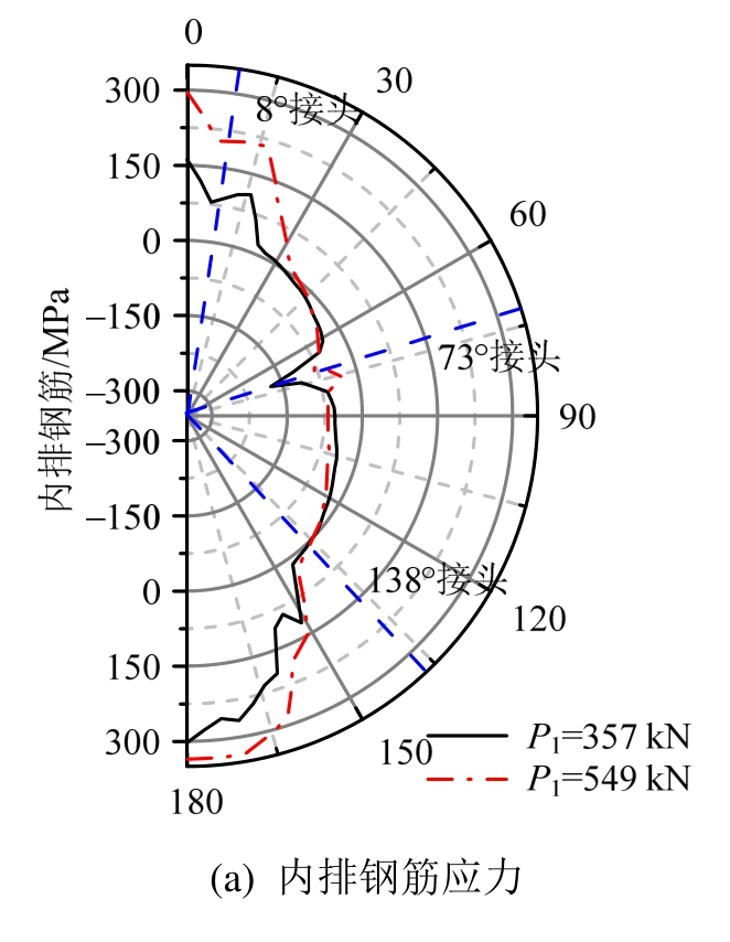 钢筋沿管片环周的应力分布如图11。沿环周0°~50°、138°~180°处,内排钢筋受拉,外排钢筋受压;60°~138°处内排钢筋受压,外排钢筋受拉。全过程只有拱底块D内排钢筋最后发生了屈服。