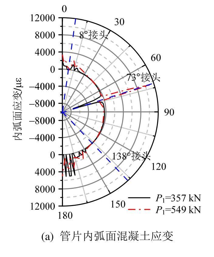 管片结构在P1=357 kN,P1=549 kN时内外弧表面混凝土最大主应变(正号为拉,负号为压)如图10所示。管片内弧面0°~30°、150°~180°,外弧面73°~110°主要受拉。管片内弧面73°接头附近,外弧面0°~30°、150°~180°等处主要受压。其中73°接头内弧面处混凝土在加固后承载力破坏时拉应力集中,可能是因为管片与加固层之间发生了剥离导致。UHPC由于施作在管片内弧表面,沿环周0°~60°和138°~180°为受拉区,60°~138°处为受压区,其中8°接头处严重受拉,应变达到0.0029。