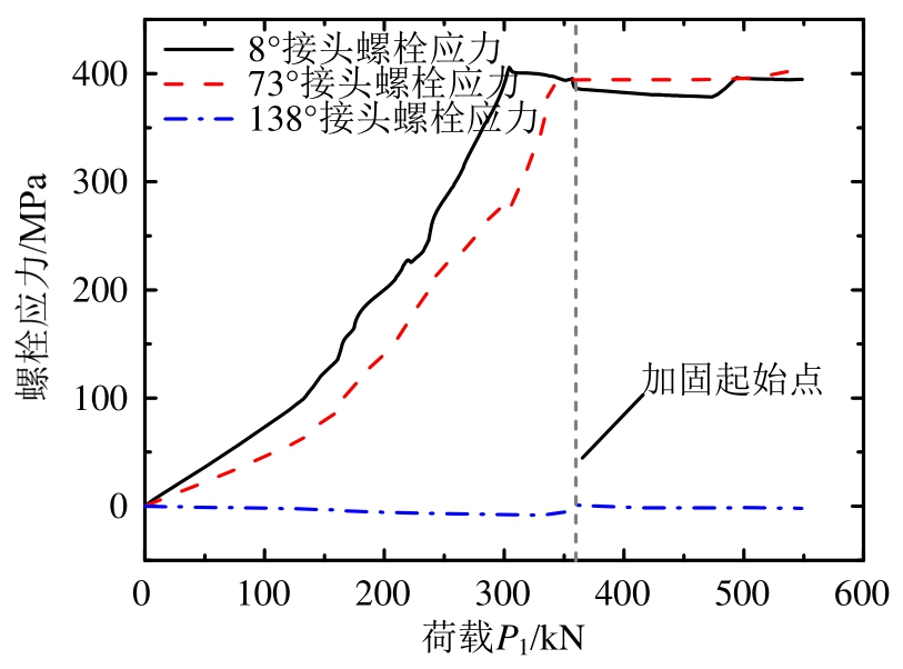 对接头平面处的承载力受力分析,可简化成是对管片断面的正截面承载力受力分析。依据平截面假定,截面应变分布如图8所示。截面受拉区承载力完全由螺栓承担,研究螺栓的应力(应变)变化尤为重要。图9为螺栓与管片嵌固处的最大主应力变化。荷载P1=300 kN时8°接头处的螺栓屈服,临近加固点(P1=357 kN)时73°接头处的螺栓开始屈服,而138°处的接头螺栓应力始终很小。加固后由于UHPC加固层分担了部分拉应力,8°接头处螺栓应力略有减小。
