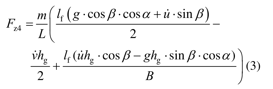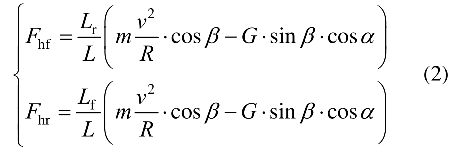 车辆在弯坡组合路段行驶时,其重力可分解为垂直于坡面的作用力G.cosα,以及平行于坡面的作用力G.sinα,平行于坡面的作用力对于横向力不产生影响,则其前后轴所受横向力如式(2)所示: