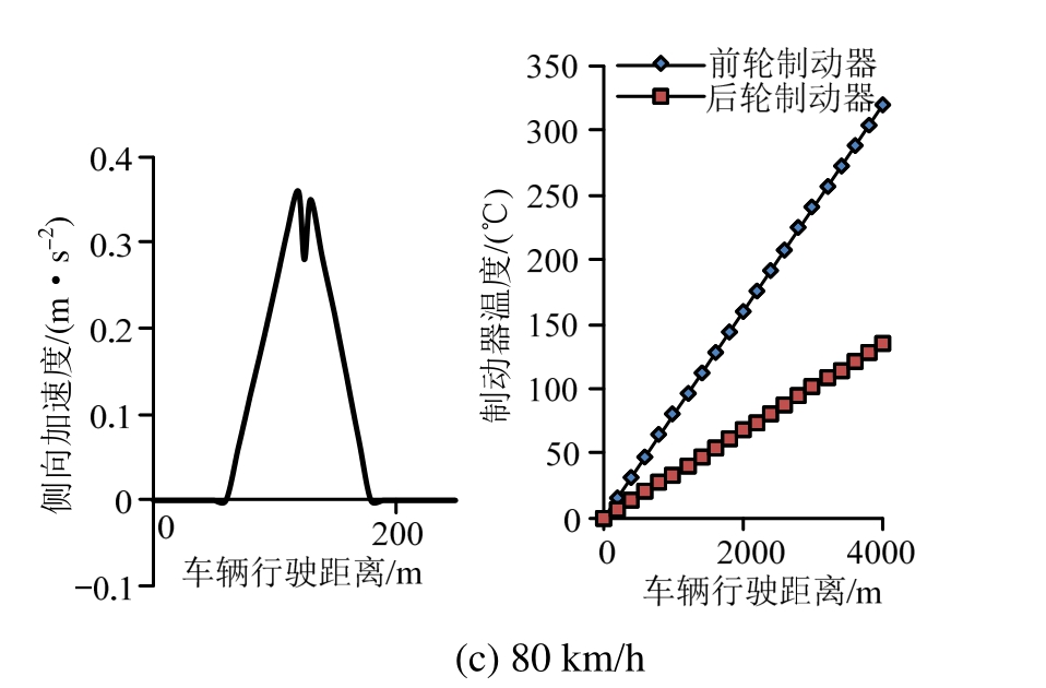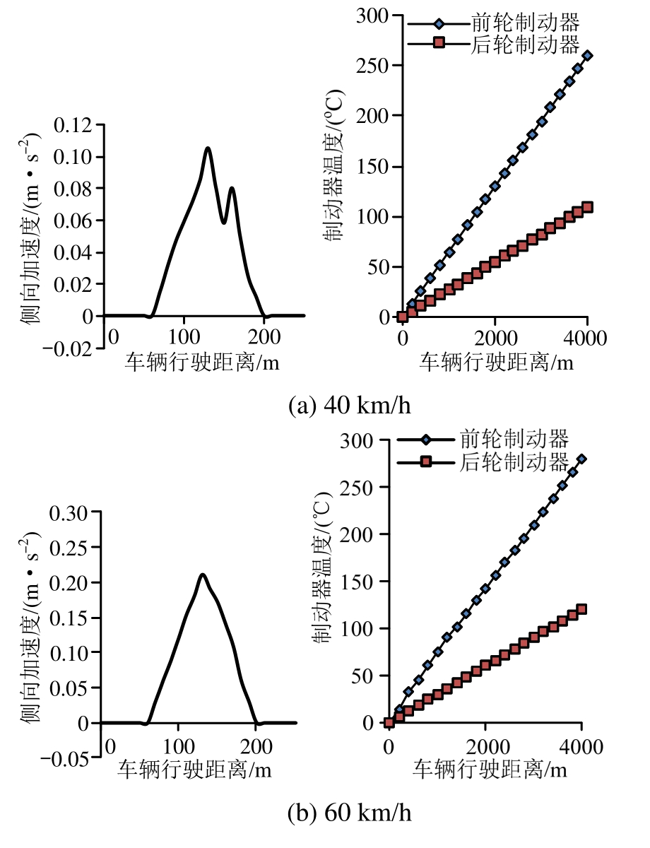 从图3可知:1) 侧向加速度最大值与行驶速度呈正比,即速度越大所受离心力越大,车辆横向稳定性越差。2) 行驶速度越大,制动器温升曲线越陡,即温度升高越快,车辆的纵向稳定性越差。但在速度较低时制动器温升曲线变化不明显。综上,仿真模型测试结果与前述安全模型分析结果一致。