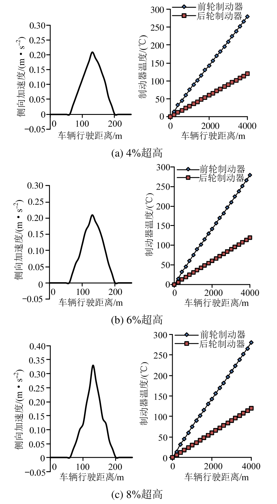 变化初始超高值4%、6%、8%三种情形,其余道路参数及车辆参数不变,让车辆在坡顶下坡制动行驶,其侧向加速度及制动器温度变化情况如图4所示。