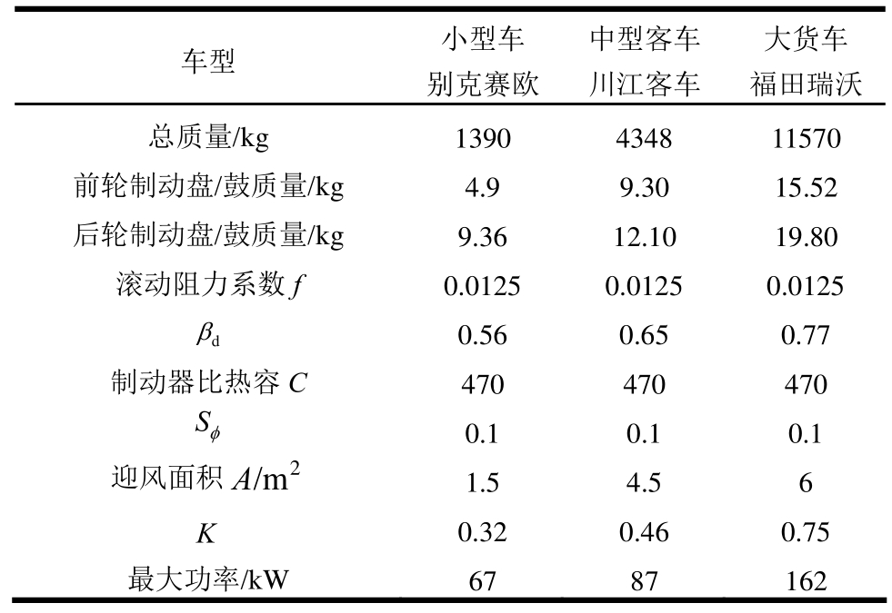 车型 小型车别克赛欧中型客车川江客车大货车福田瑞沃总质量/kg 1390 4348 11570前轮制动盘/鼓质量/kg 4.9 9.30 15.52后轮制动盘/鼓质量/kg 9.36 12.10 19.80滚动阻力系数f 0.0125 0.0125 0.0125 βd 0.56 0.65 0.77制动器比热容C 470 470 470 Sφ 0.1 0.1 0.1迎风面积/m2A 1.5 4.5 6 K 0.32 0.46 0.75最大功率/kW 67 87 162