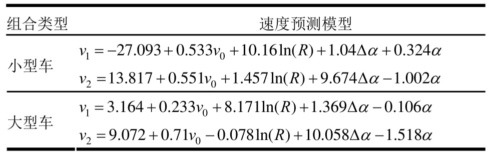 组合类型 速度预测模型v=-+++Δα+α 27.0930.53310.16ln()1.040.324 v R小型车10 v2=+++Δα-α 13.8170.5511.457ln()9.6741.002 v0R v=+++Δα-α 3.1640.2338.171ln()1.3690.106 v R大型车10 v2=+-+Δα-α 9.0720.710.078ln()10.0581.518 v0R