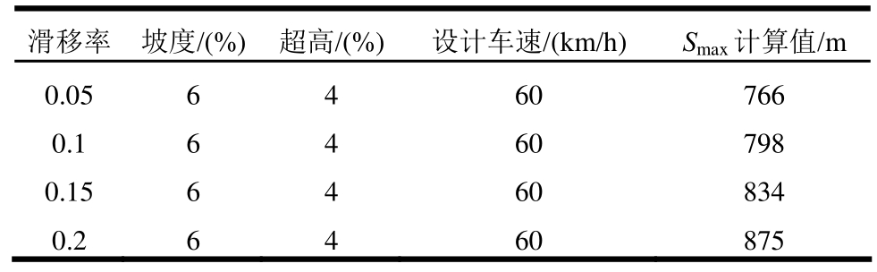 滑移率 坡度/(%) 超高/(%) 设计车速/(km/h) Smax计算值/m 0.05 6 4 60 766 0.1 6 4 60 798 0.15 6 4 60 834 0.2 6 4 60 875