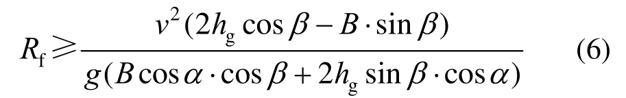 当车辆所受横向力矩大于等于稳定力矩时将发生横向侧翻,此时车辆内侧车轮的地面支撑力为0。要避免发生此种事故,弯坡组合路段的最小半径应满足式(6):