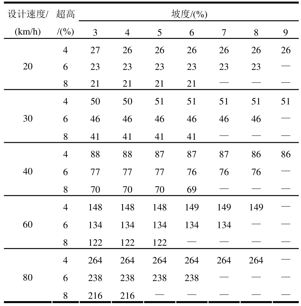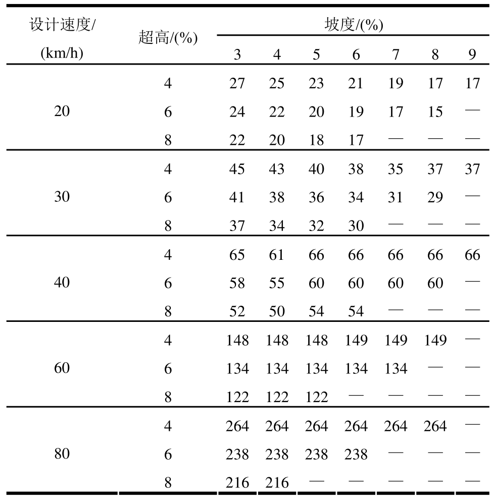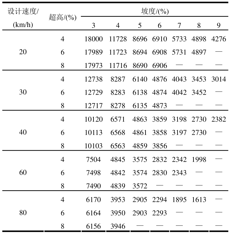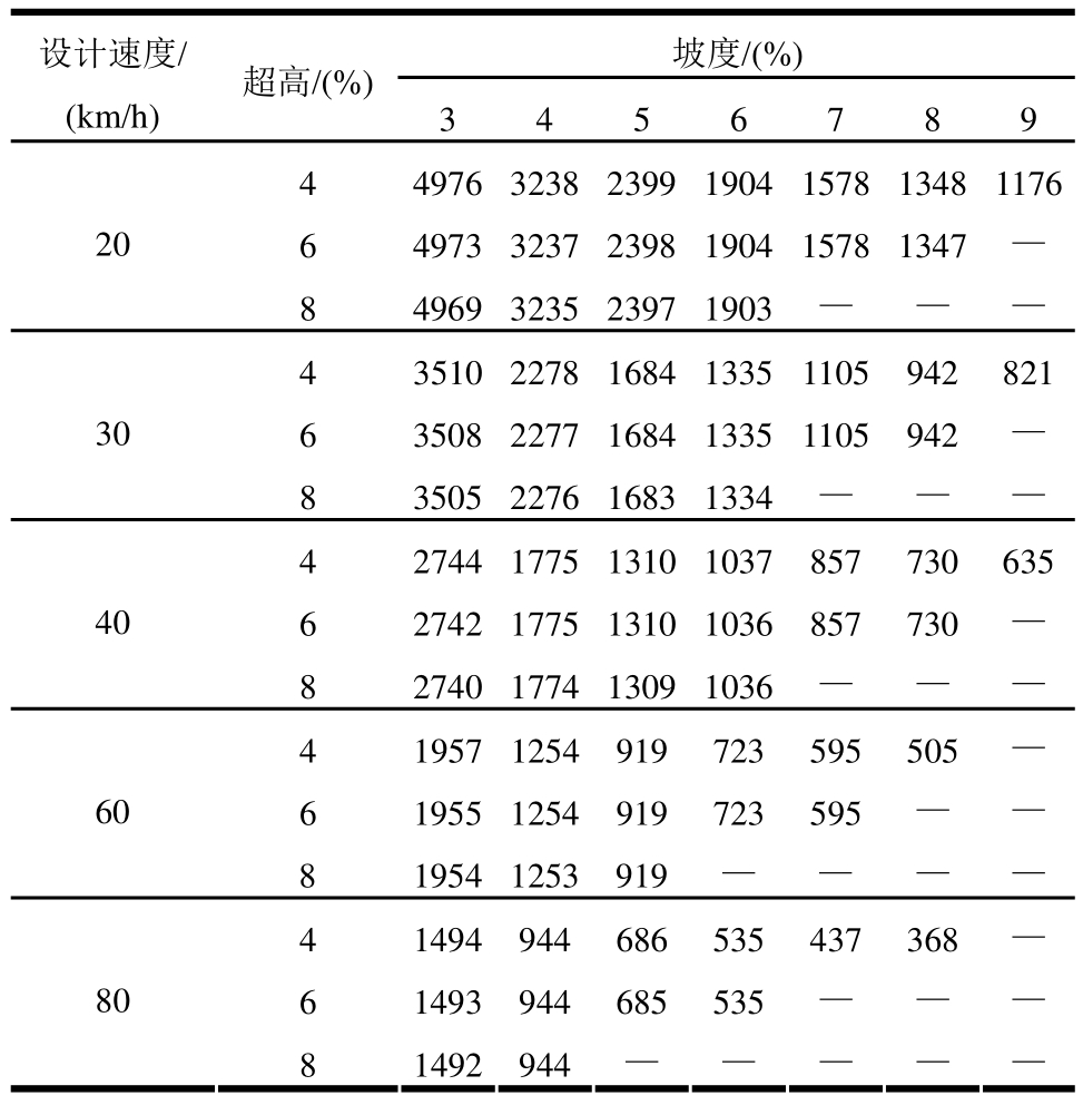 设计速度/超高/(%)(km/h)坡度/(%)3 4 5 6 7 8 9 4 4976 3238 2399 1904 1578 1348 1176 206 4973 3237 2398 1904 1578 1347 —8 4969 3235 2397 1903 — ——4 3510 2278 1684 1335 1105 942 821 306 3508 2277 1684 1335 1105 942 —8 3505 2276 1683 1334 — ——4 2744 1775 1310 1037 857 730 635 406 2742 1775 1310 1036 857 730 —8 2740 1774 1309 1036 — ——4 1957 1254 919 723 595 505 —606 1955 1254 919 723 595 ——8 1954 1253 919 — — ——4 1494 944 686 535 437 368 —806 1493 944 685 535 — ——8 1492 944 — — — ——