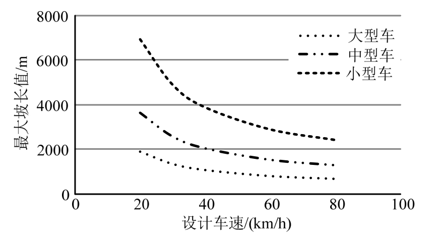 从图2可以看出,不同车型对应的最大坡长值差异较大,车型越大、制动性能越差,对应的最大坡长值越小。考虑到山区公路通行特殊重载车辆的需求,以及超载的情形,最大坡长值还须根据计算模型进行校核。