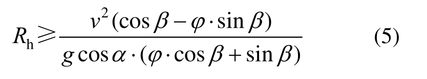 对比单弯道路段不发生横向侧滑的最小半径为:Rhmin≥v2(1-ϕ.tanβ)/(g (ϕ+tanβ))。当叠加上纵坡作用因素后,因此时cosα<1,则Rh>Rhmin,即同样条件下,弯坡组合路段的侧滑临界最小半径值大于单弯道路段的侧滑临界最小半径值,弯坡组合路段较单弯道路段更易发生侧滑失稳。
