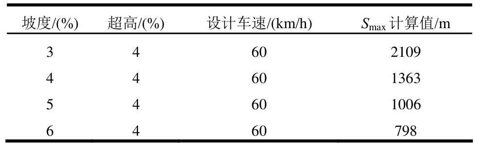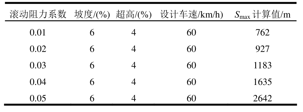 滚动阻力系数 坡度/(%) 超高/(%) 设计车速/km/h) Smax计算值/m 0.01 6 4 60 762 0.02 6 4 60 927 0.03 6 4 60 1183 0.04 6 4 60 1635 0.05 6 4 60 2642