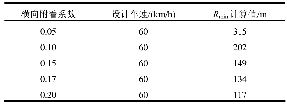 横向附着系数 设计车速/(km/h) Rmin计算值/m 0.05 60 315 0.10 60 202 0.15 60 149 0.17 60 134 0.20 60 117