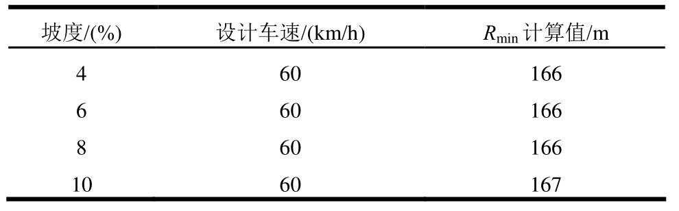 坡度/(%) 设计车速/(km/h) Rmin计算值/m 4 60 166 6 60 166 8 60 166 10 60 167