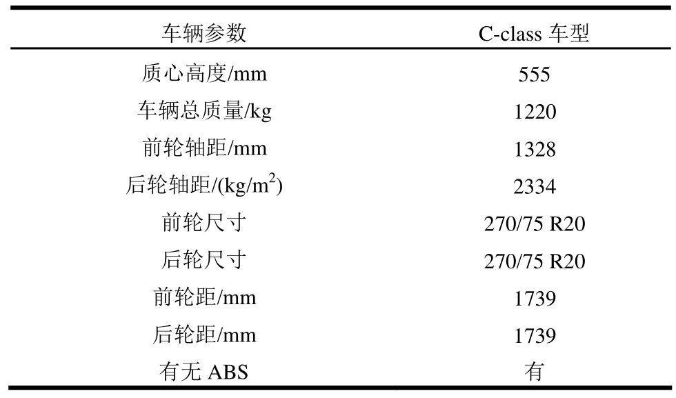 车辆参数 C-class车型质心高度/mm 555车辆总质量/kg 1220前轮轴距/mm 1328后轮轴距/(kg/m2) 2334前轮尺寸 270/75 R20后轮尺寸 270/75 R20前轮距/mm 1739后轮距/mm 1739有无ABS 有