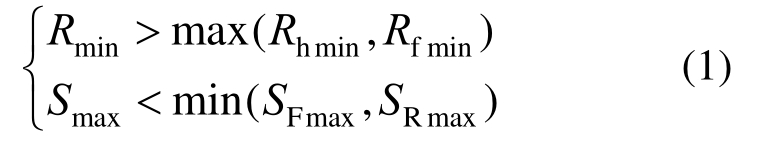 式中:Rhmin/m为保证不发生横向侧滑失稳的最小半径;Rfmin/m为保证不发生横向侧翻失稳的最小半径,可由式(4)和式(5)计算得到;SFmax/m、SRmax/m 为保证前后轮制动器不失效对应的最大坡长,可由式(12)计算得到。
