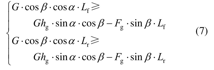 当车辆在弯坡组合路段上、下坡向行驶时,要避免发生纵向倾覆,各力矩需同时满足式(7):