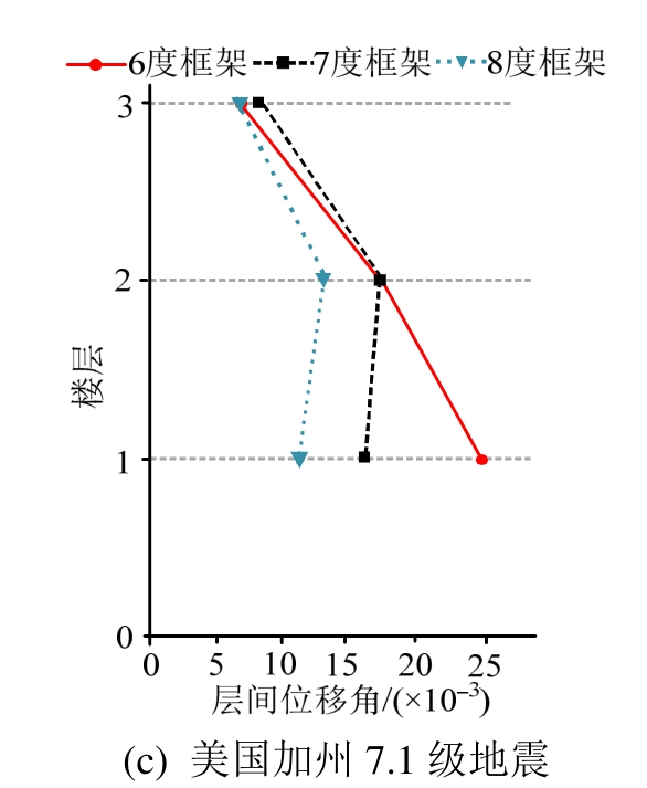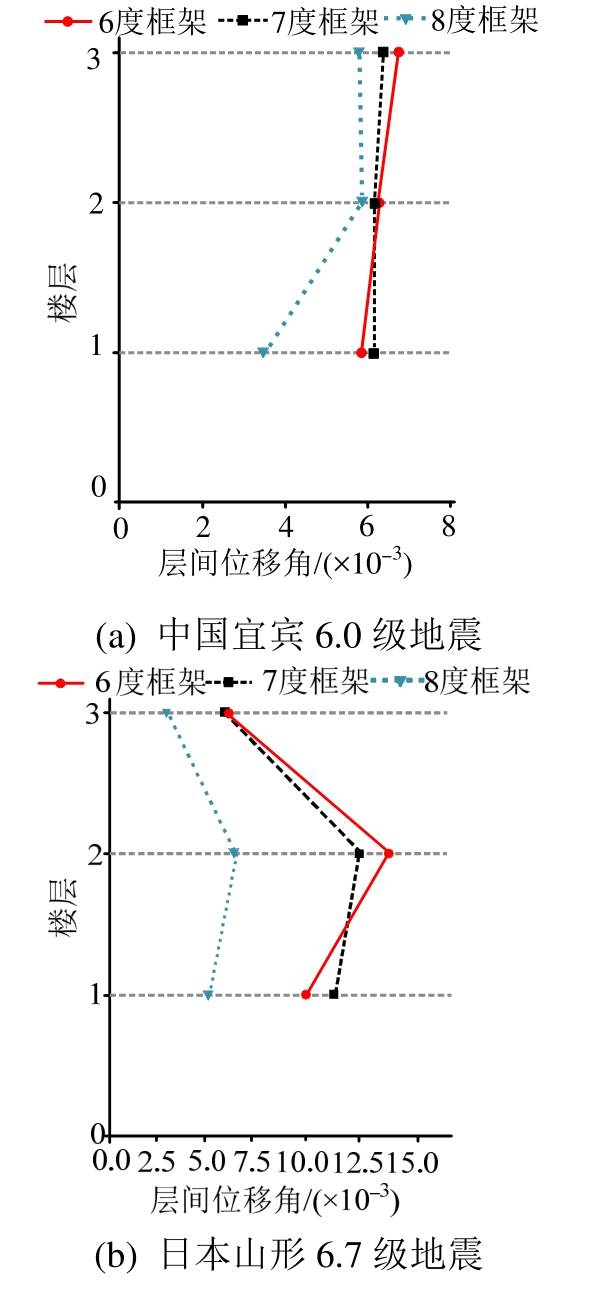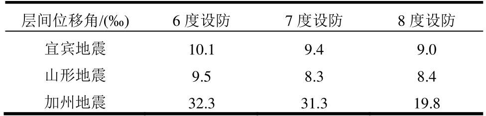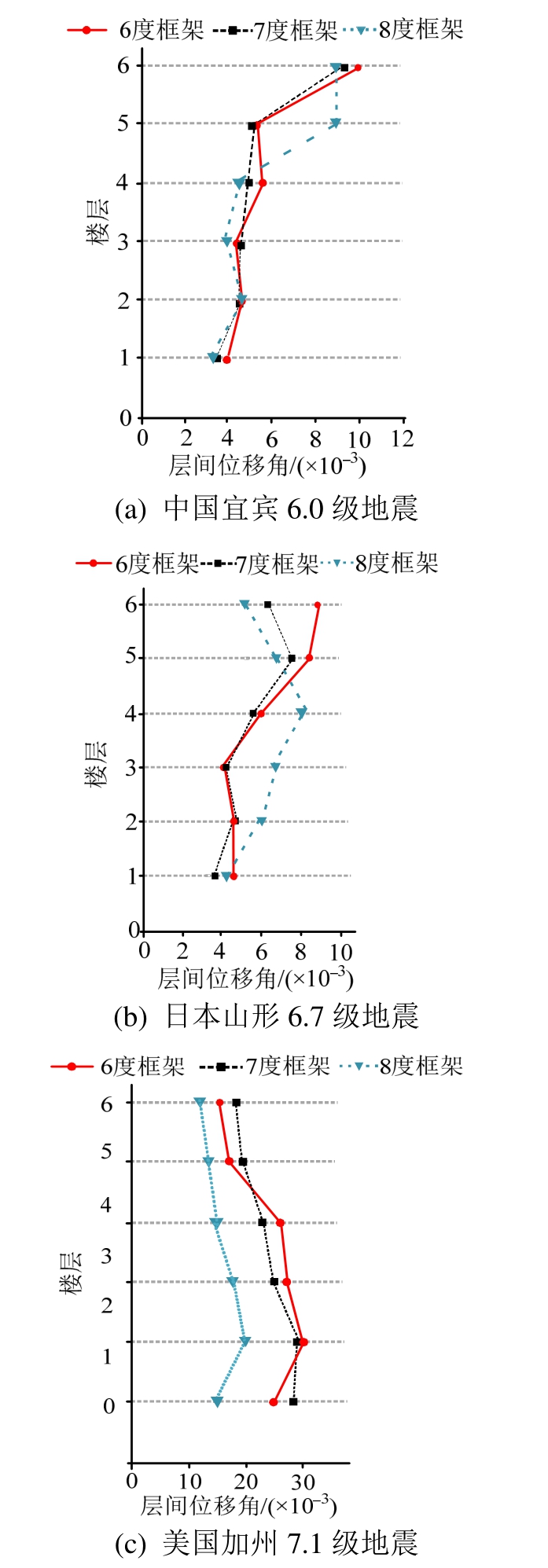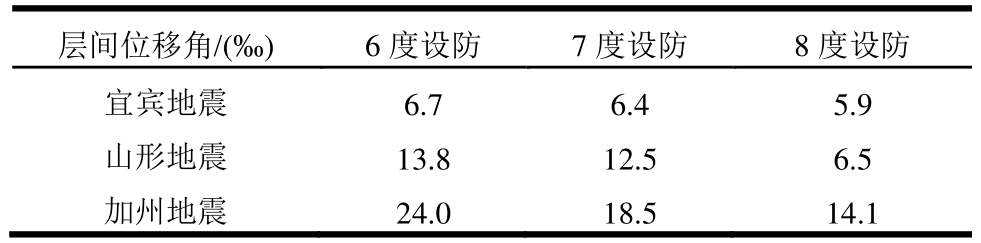 从3层框架结构的层间位移角包络图和结构最大层间位移角的比较可以看出:美国加州地震造成的结构层间位移角响应总体上要大于日本山形地震和中国宜宾地震;宜宾地震造成的3层框架结构层间位移角响应最小。