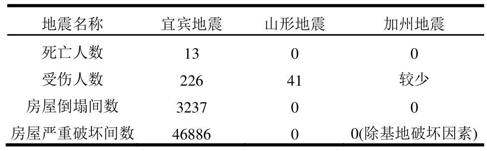 地震名称 宜宾地震 山形地震 加州地震死亡人数 13 0 0受伤人数 226 41 较少房屋倒塌间数 3237 0 0房屋严重破坏间数46886 0 0(除基地破坏因素)
