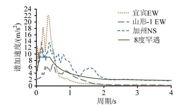 从反应谱来看,宜宾地震的破坏力并不是最强,在自振周期0.7 s~1.5 s内对应的谱加速度要小于山形地震和加州地震。然而,宜宾地震的震害要山形地震与加州地震严重很多。这与地震发生区域的建筑设防水平有关。