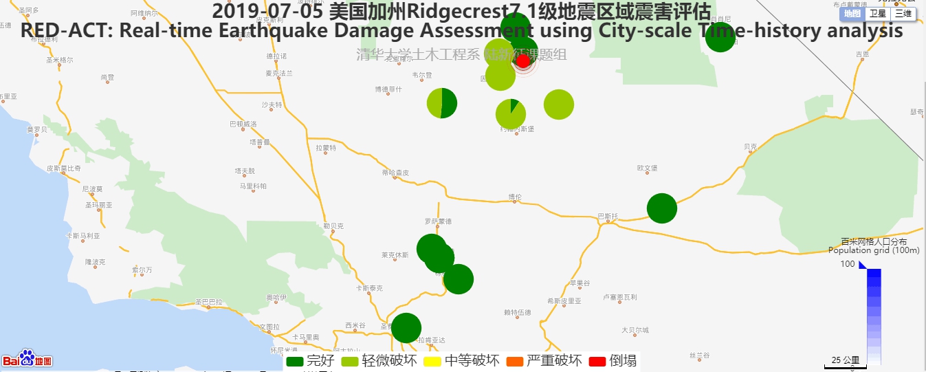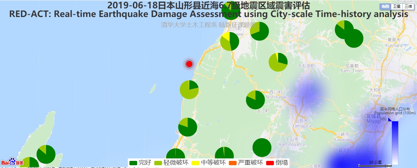 本文共收集到中国宜宾地震23组地震动,日本山形地震25组地震动,美国加州地震9组地震动。在此基础上,采用RED-ACT系统进行了地震区域破坏分析。图11~图13依次为宜宾地震、山形地震、加州地震震中附近范围内台站记录分析得到的建筑震害分布示意图。图11与图12中蓝色部分表示人口密度,图13无人口密度数据。