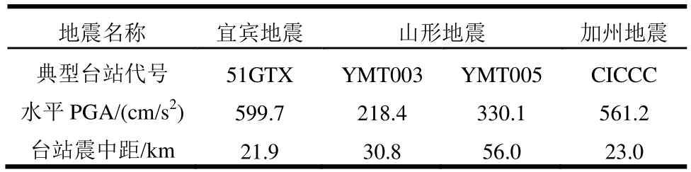 地震名称宜宾地震山形地震加州地震典型台站代号51GTX YMT003 YMT005 CICCC水平PGA/(cm/s2)599.7 218.4 330.1 561.2台站震中距/km 21.9 30.8 56.0 23.0