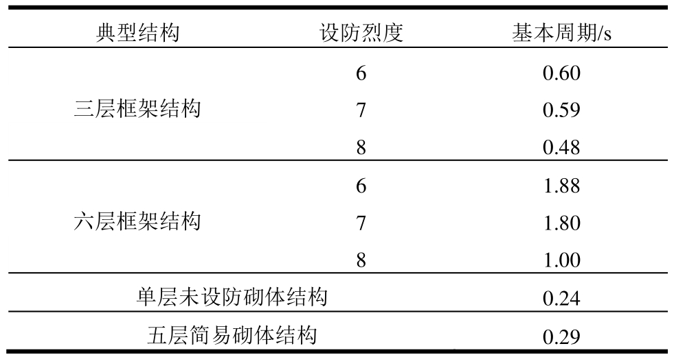 除了地震的复杂性,结构自身的动力特性的复杂性对结构的地震响应也有影响。因此,本文基于OpenSees有限元平台,将上述典型地震动加速度时程输入到典型结构模型中,以研究建筑结构的地震响应。典型结构包括多层框架结构、砌体结构等,其基本自振周期如表3所示。
