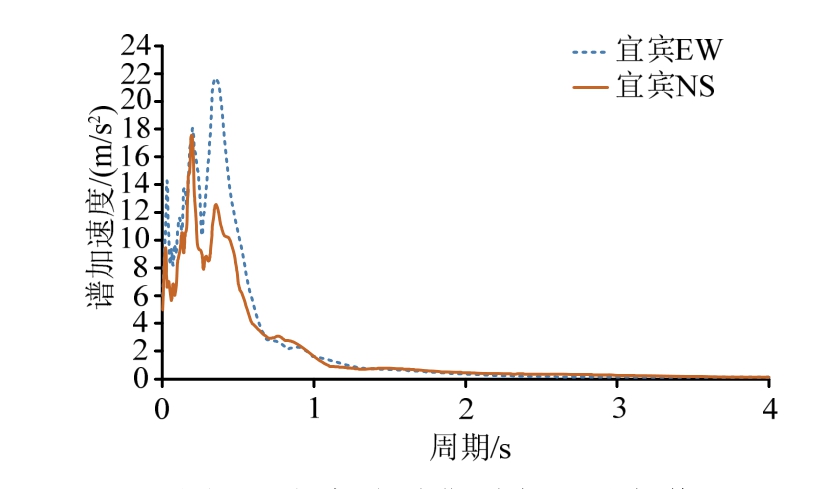 从图4可以看出,宜宾地震的反应谱主要集中在短周期段,0.7 s以后中长周期段谱加速度较小。而加州地震、山形地震的谱加速度在0.7 s~1.5 s周期段要高于宜宾地震的谱加速度。