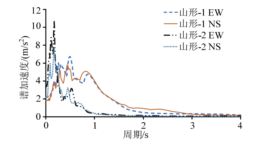 将上述四个台站所记录的地震动水平方向分量的加速度时程绘制成反应谱(5%阻尼)。其中将表2的YMT003台站记录简称为山形-1,将YMT005台站记录简称为山形-2。三次地震对应的地震动水平分量反应谱分别如图1~图3所示。