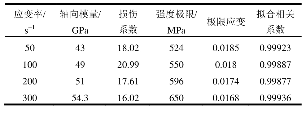 (2) 在较高的应变率范围内,氟金云母微晶玻璃陶瓷存在明显的应变率效应。通过多项式法拟合得到材料的一维弹脆性损伤动态本构方程及各参数与应变率之间关系。