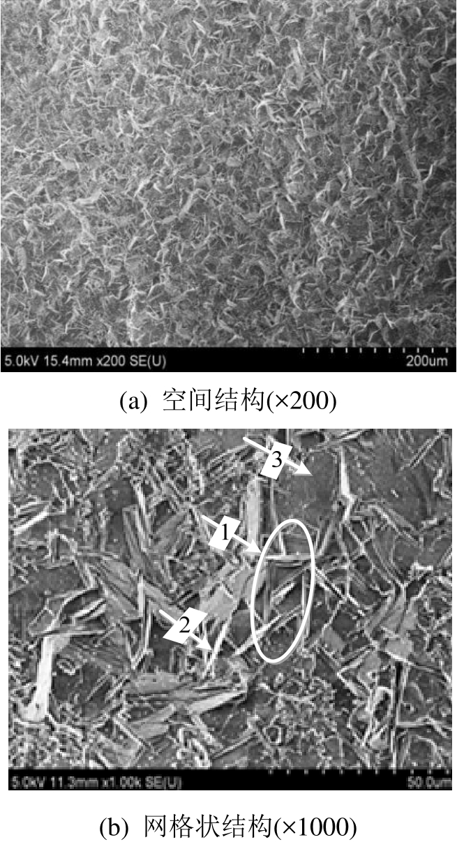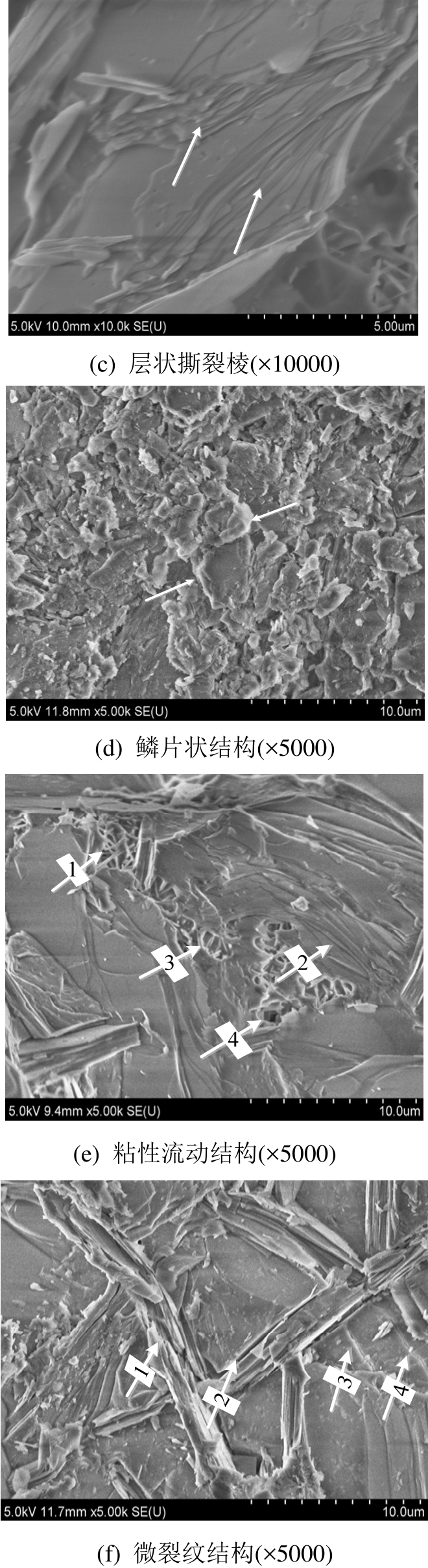 为了进一步分析该材料的断裂失效机理,对断口微观形貌进行了观察(见图9)。由图9可知,微晶玻璃陶瓷的云母相与玻璃相组成错综交错的空间结构,云母相均匀分布,且云母相所占比例较高(图9(a))。断口存在大量穿晶断裂的云母相,由层片状晶片组成,且穿晶断裂面颜色明亮(图9(b)中2);错综交错的层片状云母相将玻璃相分割成不规则的多面体,形成空间网格状结构(图9(b)中1);并保留大量的解理平台(图9(b)中3)。代表脆性断裂特征的层状撕裂棱和鳞片状结构(图9(c)和图9(d)),其中层状撕裂棱也是剪切破坏特征之一。局部出现极少代表韧性破坏的蛇形滑移样式(图9(e)中2)和粘性流动的圆形包裹棱(图9(e)中3),少数针状云母相(图9(e)中1)之间存在微孔缺陷(图9(e)中4),微孔缺陷形成于微晶玻璃陶瓷烧结冷却成形过程。
