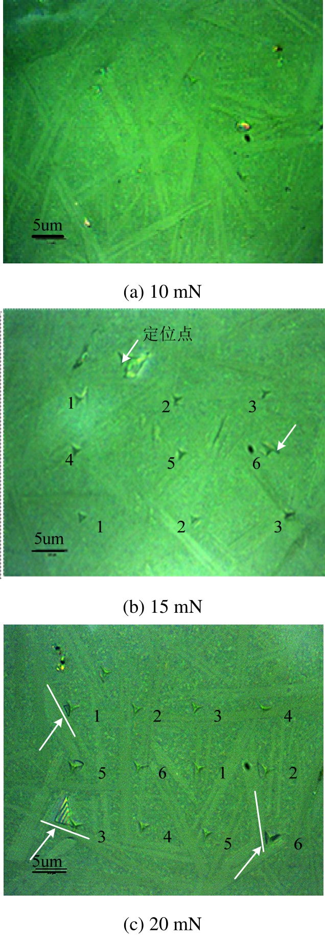 纳米压痕实验过程压头施力于试样表面,在经历弹性变形、塑性变形后,载荷达到临界值,压痕周围便会产生堆积、裂纹、崩碎等形式的破坏。实验设备为玻氏压头纳米压痕仪,以定载荷形式加载,选取加载载荷分别为10 mN、15 mN、20 mN、25 mN、30 mN、35 mN,每组载荷下进行6个加载速率的试验,保压时间20 s,每组重复3次。图10给出了部分纳米压痕形貌图,图中1~6分别表示的载荷加载速率为10 mN/min、20 mN/min、30 mN/min、40 mN/min、50 mN/min、60 mN/min。