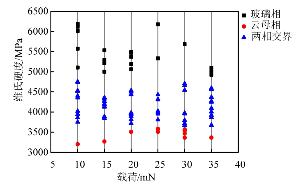 图11为维氏硬度与压痕位置关系图。由图11可知,硬度值随压痕位置而改变,玻璃相的硬度比云母相要高。其中,玻璃相的硬度5.0 GPa~6.0 GPa,云母相的硬度3.2 GPa~3.6 GPa,两相之间的硬度值介于两者之间。