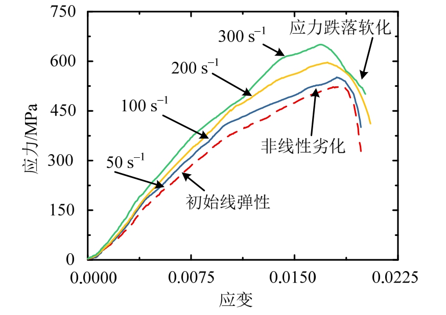微晶玻璃陶瓷的应力-应变曲线主要可分为初始线弹性、非线性劣化、应力跌落软化3个阶段[7]。在初始线弹性阶段,应力-应变曲线近似为直线,应力值小于临界最大压应力σc时,材料内部没有损伤演化,只是发生弹性变形。在非线性劣化阶段,当应力值超过σc时,试样内部应力集中或者结合力弱的部位在应力波的作用下开始发生连续性损伤,在越来越多的微裂纹成核、扩展的热力学过程中,表面能及动能的增加势必消耗更多的机械能,导致应力-应变关系呈现非线性特征,曲线的最高点为其动态强度极限σf。在应力跌落软化阶段,当应力值到达σf时,某些成熟的微裂纹需要消耗更多的能量来克服裂纹尖端的应力场实现2次扩展,由连续损伤过渡到局部损伤,材料的承载能力开始下降,应力-应变曲线表现为应力跌落。裂纹的成核、扩展需要消耗能量和时间来克服分子间的作用力,而能量来源于外力作功,动态加载过程中当时间不足以使微裂纹充分扩展时,便需要更大的能量即外力作功输入,从而在应力-应变曲线上体现出应变率效应。