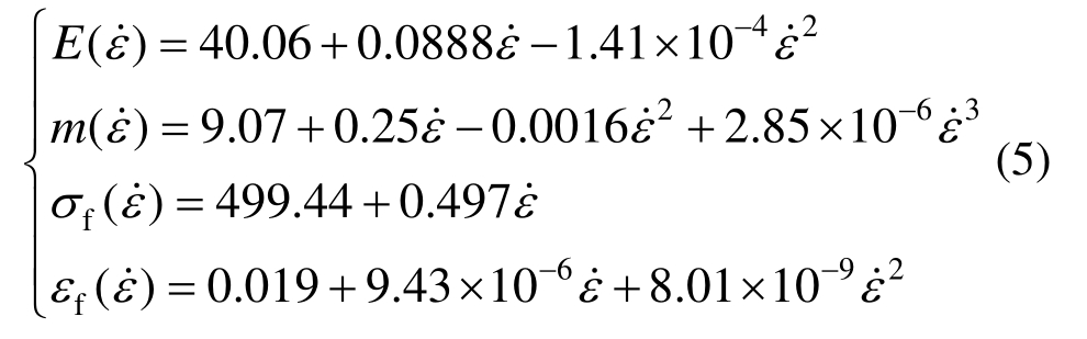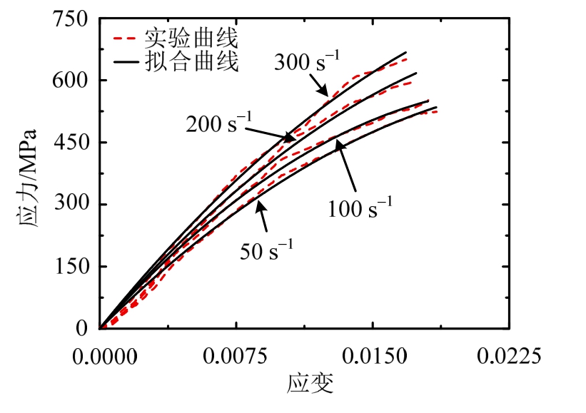 根据实验数据,采用最小二乘法对氟金云母微晶玻璃陶瓷在不同应变率下的应力-应变曲线进行多项式拟合,见图4,发现使用二次多项式拟合时拟合效果最佳,即式(2)中n=1,则动态本构方程可表示为: