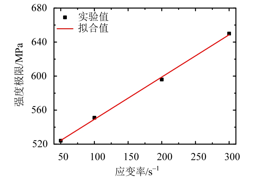 的关系曲线如图7所示,拟合相关系数R2分别为0.99775和0.99673,表明拟合结果较好。由图5可知初始轴向弹性模量随着应变率的升高在略微增大。由图6~图7可见,动态强度极限、极限应变与应变率的相关性不同,前者为正相关,后者为负相关。