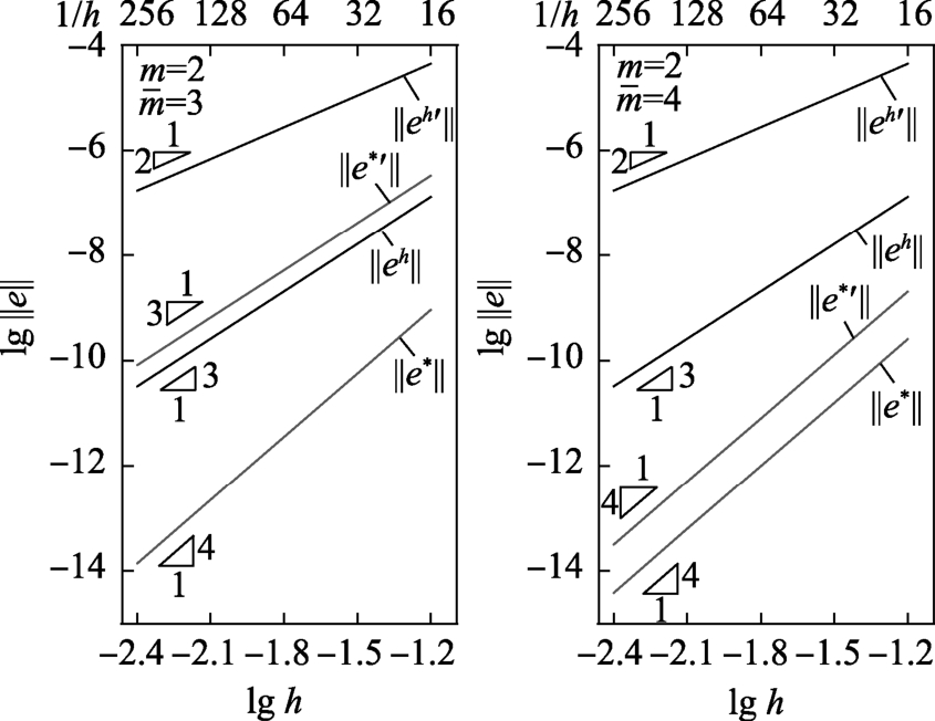 2 ne m=e r h e′ r h 16 6.3633×10-5 — 2.0362×10-2 —32 7.8568×10-6 3.02 5.1205×10-3 1.99 64 9.7296×10-7 3.01 1.2810×10-3 2.00 128 1.2100×10-7 3.01 3.2027×10-4 2.00 256 1.5088×10-8 3.00 8.0074×10-5 2.00 r的理论值 — 3 — 2 ne m=3 e* r e*′ r 16 3.2616×10-6 — 8.9182×10-4 —32 2.0346×10-7 4.00 1.1320×10-4 2.98 64 1.2710×10-8 4.00 1.4205×10-5 2.99 128 7.9425×10-10 4.00 1.7773×10-6 3.00 256 4.9639×10-11 4.00 2.2222×10-7 3.00 r的理论值 — 4 — 3 ne m=4 e* r e*′ r 16 2.6600×10-6 — 3.2351×10-5 —32 1.6683×10-7 3.99 1.9570×10-6 4.05 64 1.0425×10-8 4.00 1.2151×10-7 4.01 128 6.5147×10-10 4.00 7.5496×10-9 4.01 256 4.0711×10-11 4.00 4.7017×10-10 4.01 r的理论值 — 4 — 4