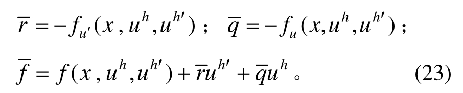采用更高次单元求解该边值问题可获得单元上的超收敛解。但该边值问题仍是非线性的,需迭代求解,为避免迭代求解,对方程右边项f(x,u,u′)在有限元解答处作Taylor展开,有: